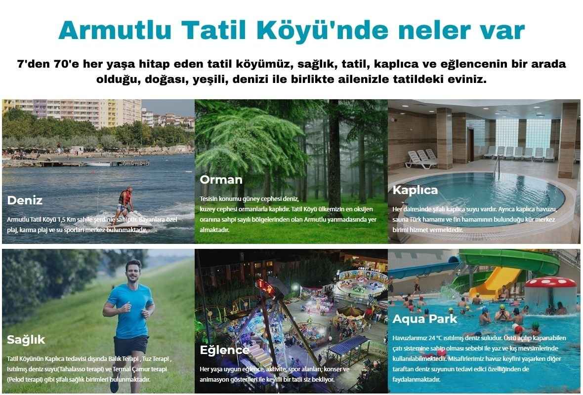 7'den 70'e her yaşa hitap eden tatil köyümüz, sağlık, tatil, kaplıca ve eğlencenin bir arada olduğu, doğası, yeşili, denizi ile birlikte ailenizle tatildeki eviniz.